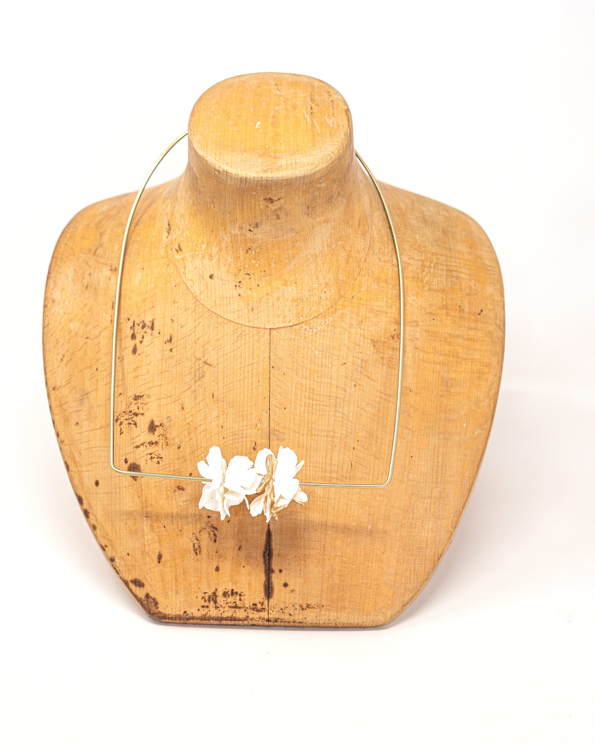 Brass necklace with 4 white flowers and streaks of gold