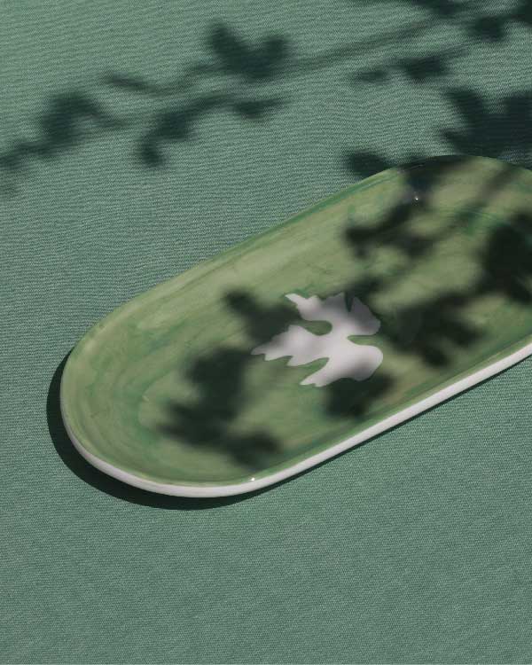 A smooth oval platter washed in soft green, centered with a white leaf motif. Calm and earthy, ideal for serving or as a decorative accent.