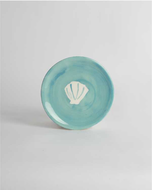 A washed blue ceramic plate featuring a white shell design. Light and refreshing, inspired by the movement of water.