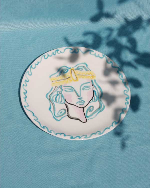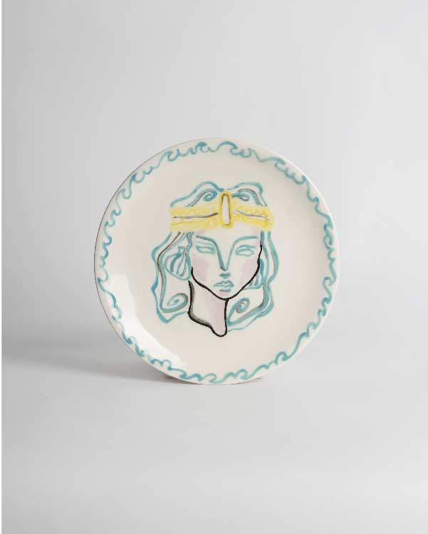 A ceramic plate featuring a bold hand-painted portrait of Tsovinar, the goddess of water and storms. Cool blue lines frame the design, giving the piece a calm, flowing character.
